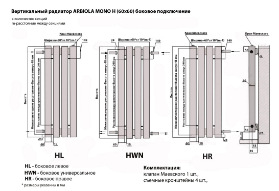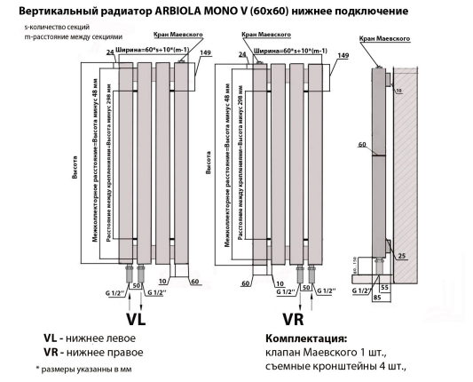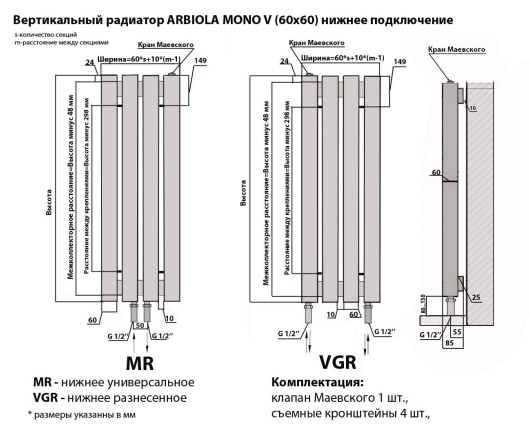 Максимальная температура: Радиаторы выпускаются с боковым и нижним подключением к системе отопления, присоединительный размер G 1/2".